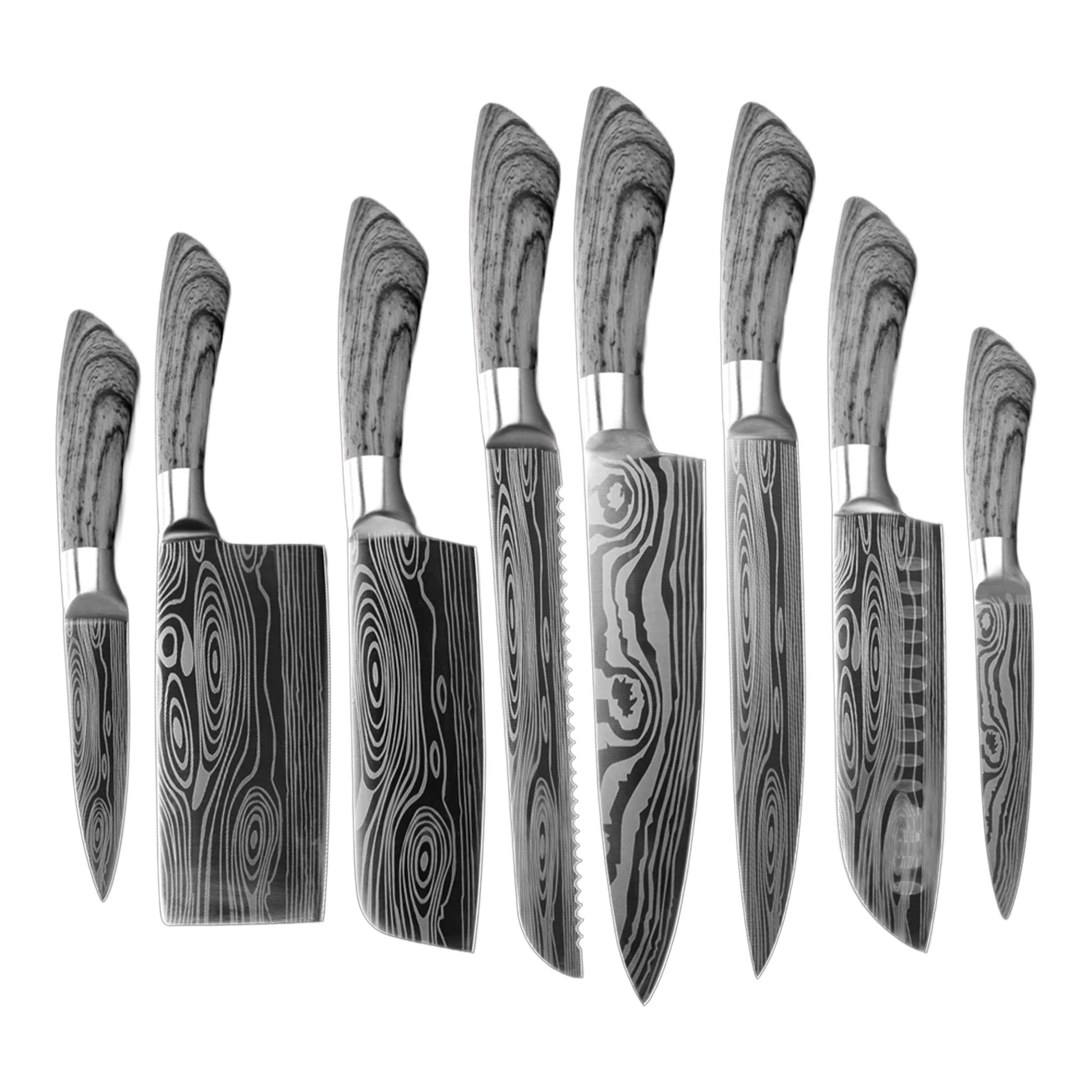 The set can be customized from 1 to 8 pieces, allowing you to choose only the tools you need or invest in a complete knife lineup. Typical blade choices in this series include a chef knife, Santoku knife, cleaver, utility knife, bread knife, carving knife, and paring knife—each designed for specific cutting tasks such as chopping vegetables, slicing meats, cleaving bones, carving roasts, dicing fruits, or handling precision work like peeling and trimming.