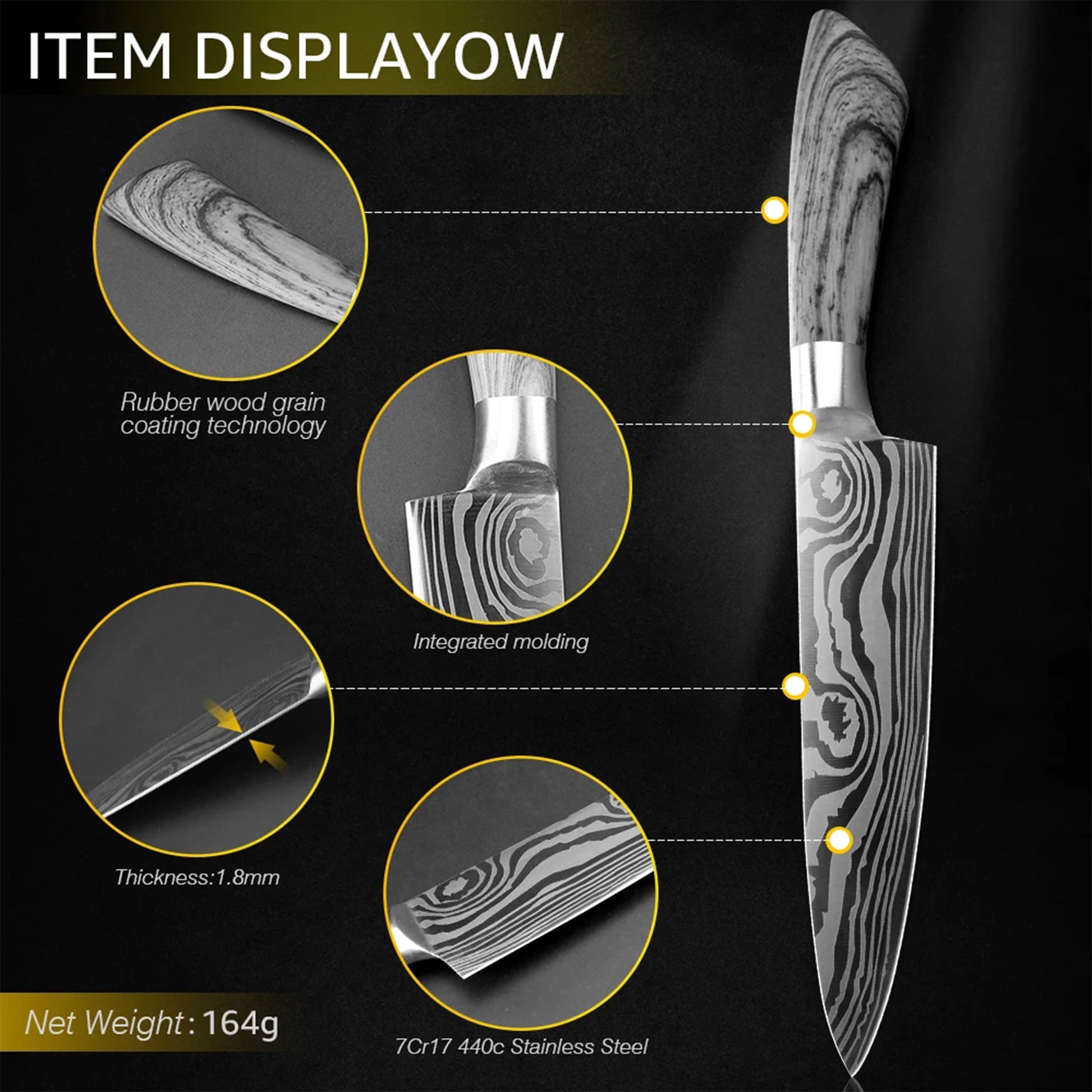 In summary, the 1–8 Piece Japanese Chef Knife Set – 7Cr17/440C Stainless Steel Kitchen Tools offers a powerful combination of cutting precision, premium steel craftsmanship, ergonomic comfort, and visual elegance. Whether used for everyday cooking or gourmet preparation, this set equips you to slice, chop, and carve with confidence, efficiency, and style. Add it to your kitchen toolkit and experience a noticeable upgrade in every cut.
