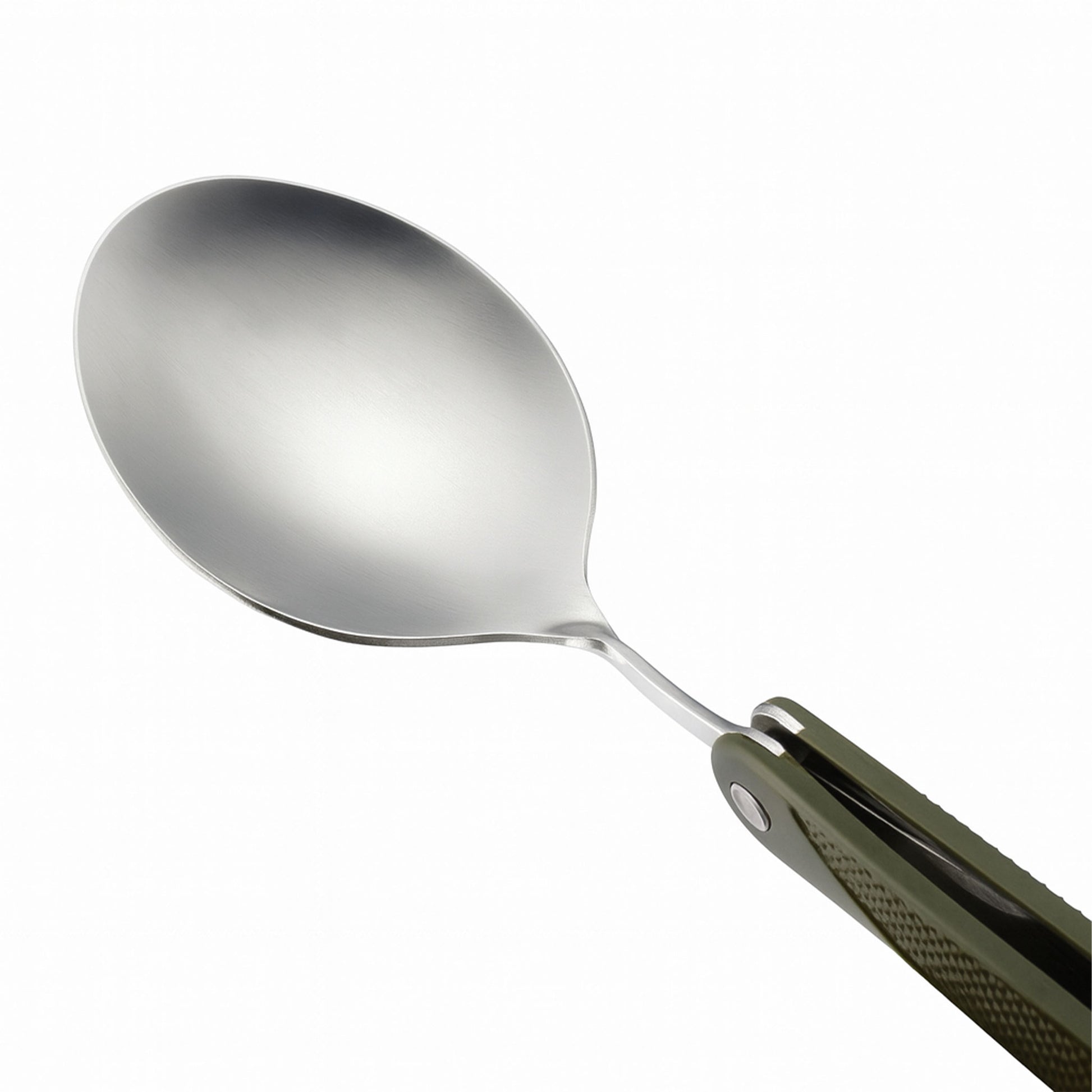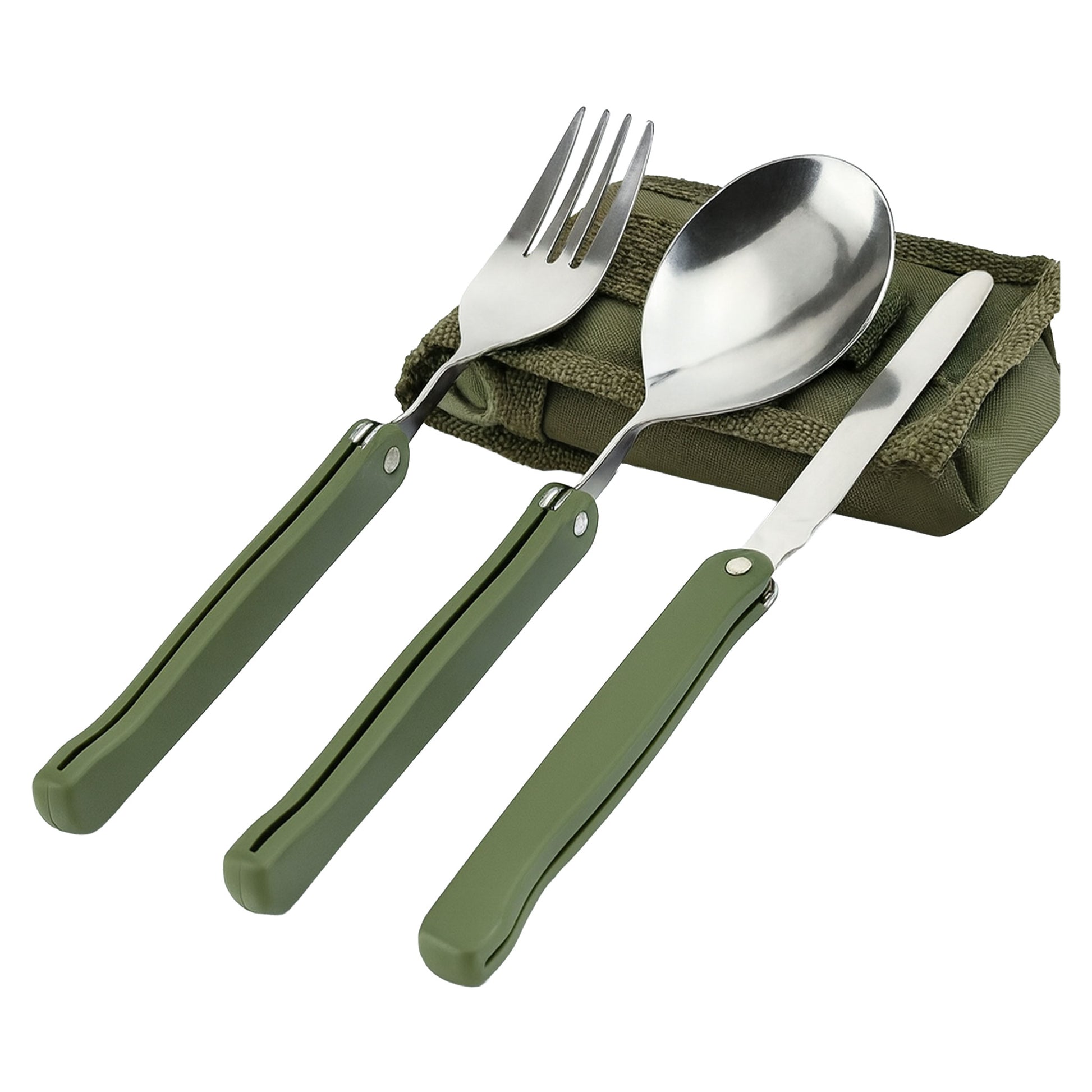 The ergonomic handles are designed for comfort, offering a solid grip even when used for extended periods. Their green finish not only complements the pouch but also gives the utensils a rugged, military-inspired look, appealing to outdoor enthusiasts who appreciate both style and function.